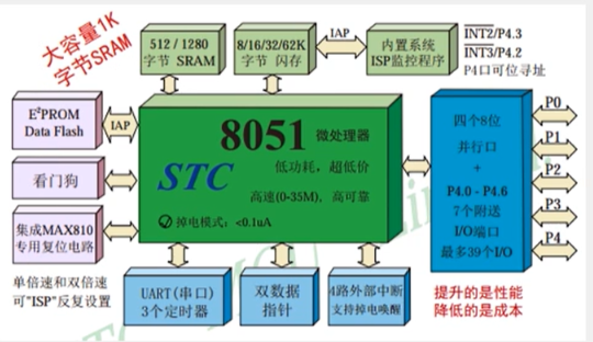 - 内部集成了CPU 、RAM 、ROM 、定时器、中断系统、通讯接口等一系列电脑的常用硬件功能
