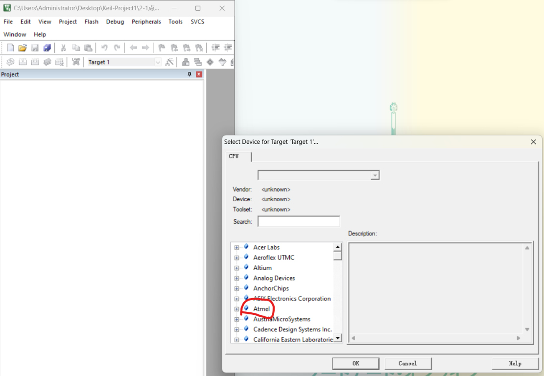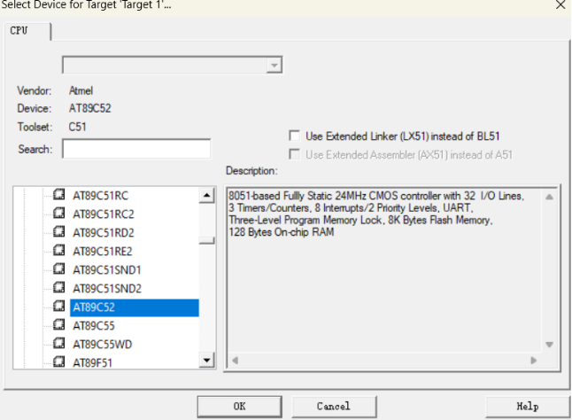 - 创建一个Project,在列表里的Atmel下选择AT89C52