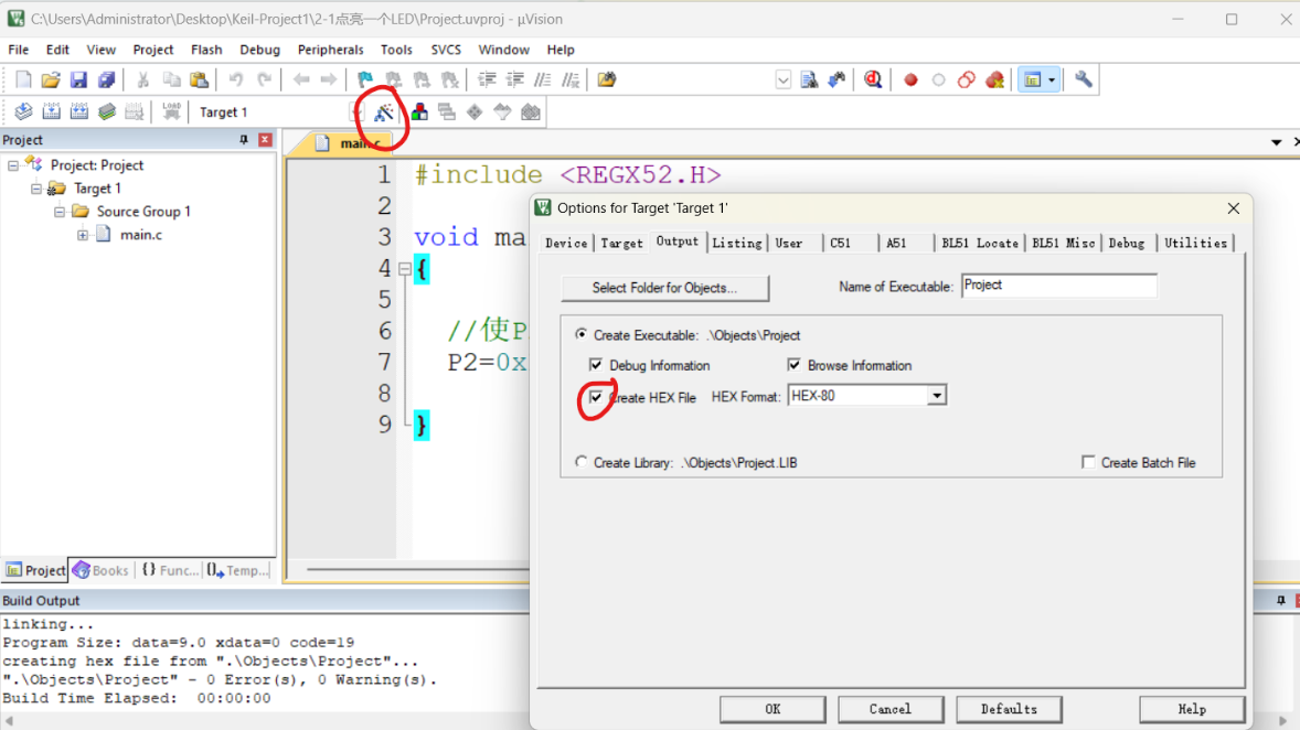 void main() { while(1) { P2=0xFE; Delay500ms(); P2=0xFF; Delay500ms(); }