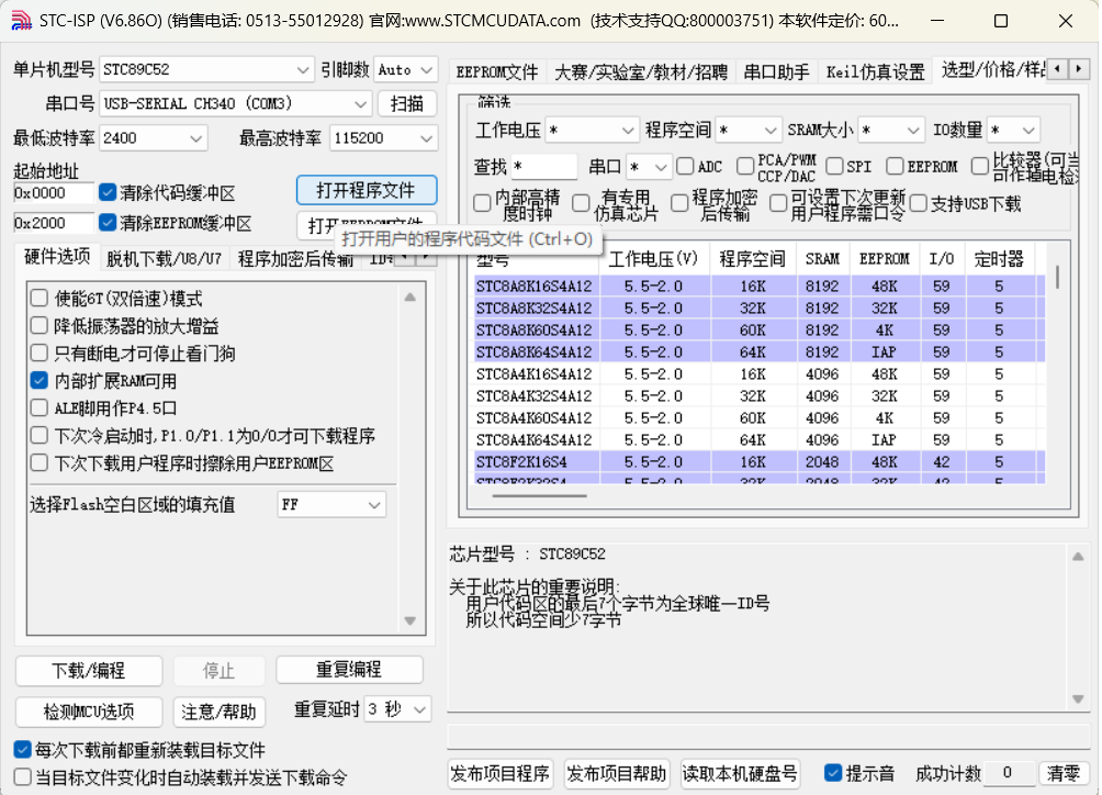 选择相应的单片机型号与串口号,并打开已写好的程序文件