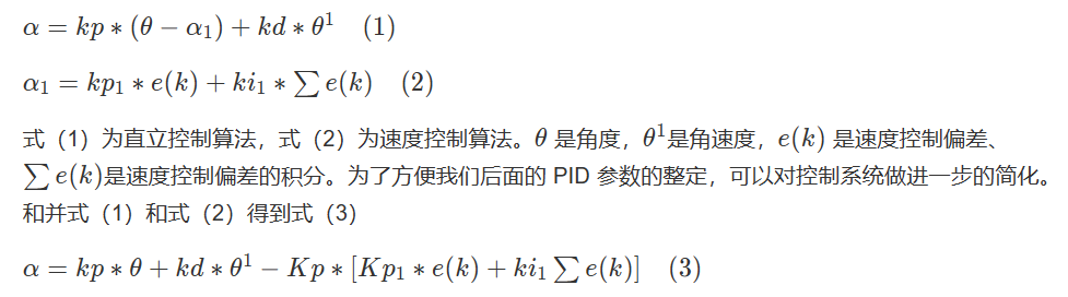 根据上面的原理图,我们把速度和直立两个控制器串联起来工作,其中速度控制的输出作为直立控制的输入,而直立控制的输出作为系统的输出,这其实就是一个串级控制系统。直立控制在前面有介绍,使用的 PD 控制。因为编码器可能存在的噪声,为防止噪声被放大并消除系统的静差,这里我们速度控制使用 PI 控制。